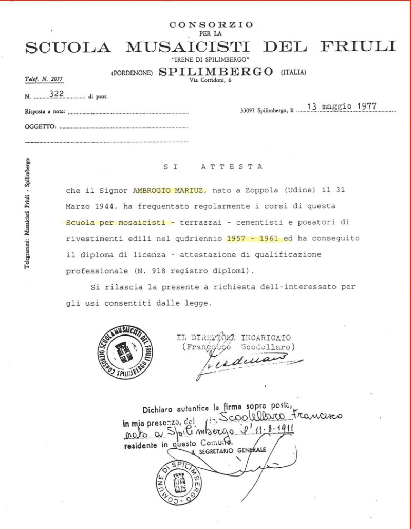 A native of northern Italy, Ambrose Mariuz graduated in 1961 from the prestigious,”Scuola Musaicisti Del Friuli,” one of the few schools which teaches the art of old world mosaic.